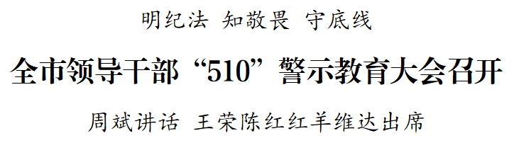 5月10日,市委召开全市领导干部“510”警示教育大会,深入学习贯彻党的二十大和习近平总书记参加江苏代表团审议时重要讲话精神,全面落实中央和省委部署,通过以案明纪、警钟长鸣,推动各级党员干部真正做到自重自省、自警自励,永葆忠诚、干净、担当的政治本色,为全面推进中国式现代化盐城新实践开好局、起好步提供坚强政治保证。市委书记周斌出席并讲话。市人大常委会主任王荣、市政协主席陈红红出席,市委副书记、统战部部长羊维达主持。