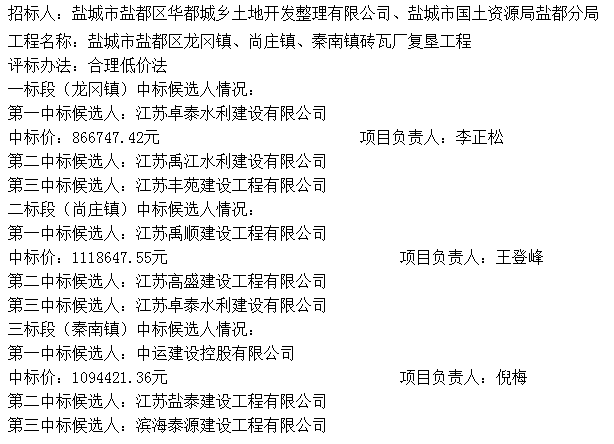盐城市盐都区龙冈镇、尚庄镇、秦南镇砖瓦厂复垦工程中标公示