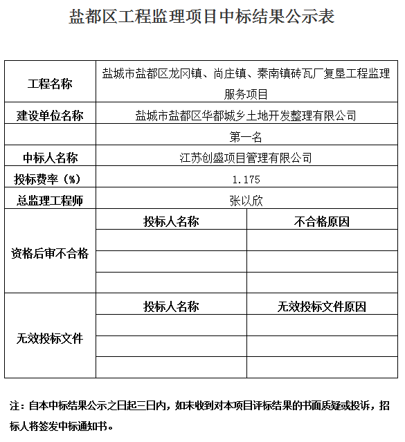 盐城市盐都区龙冈镇、尚庄镇、秦南镇砖瓦厂复垦工程监理服务项目中标结果公示