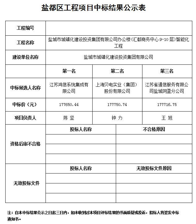 盐城市张庄全民双创园标准化工业厂房(一期)工程中标结果公示