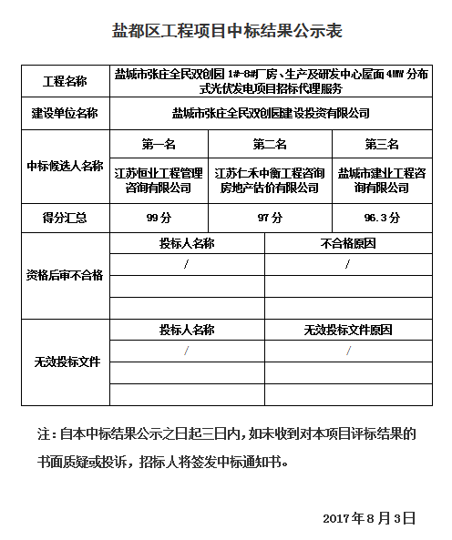 盐城市张庄全民双创园1#-8#厂房、生产及研发中心屋面4MW分布式光伏发电项目招标代理服务中标结果公示