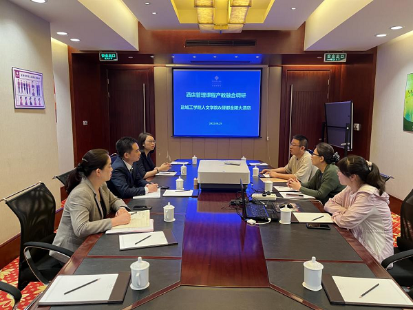 8月29日下午,盐城工学院人文社会科学学院酒店管理系刘鹏、葛江徽等老师来到驿都大酒店就产教融合开展座谈与实地调研,酒店人力资源总监蔡秀霞、房务总监唐家奎、餐饮总监蔡萍参加了调研交流活动。