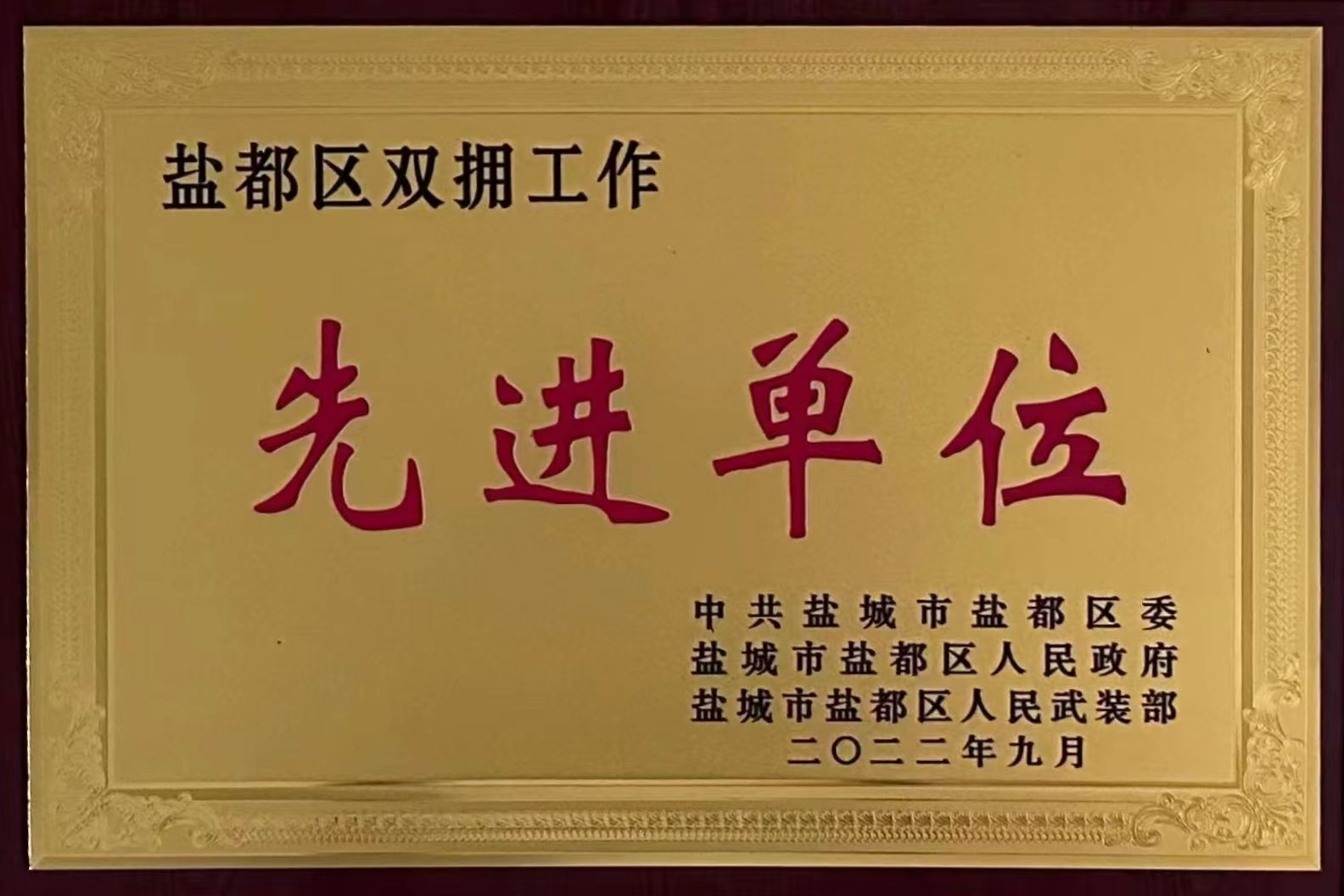 近日,经区委、区政府、人民武装部批准,集团荣获2022年度盐都区双拥工作先进单位。