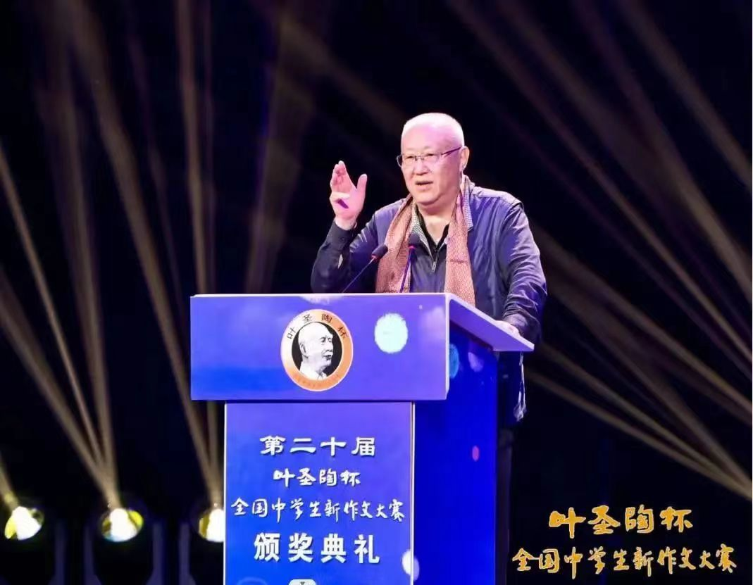 大赛顾问、著名作家、中国作家协会原副主席高洪波一直关注、支持叶圣陶杯大赛,曾连续数届参加大赛活动,为获奖选手作文学指导讲座。本届大赛又应邀前来出席颁奖典礼,并担纲终评评委。在大会讲话中,他回忆了多年来参加叶圣陶杯大赛活动的往事,表达了对二十年大赛的特殊感情,对大赛的未来发展提出了殷切的希望。他从自己少年时写作获奖的经历谈起,阐明了赛事活动对孩子人生道路的影响。他提出,一部优秀的作品可以改变世界,正如“草房子”由曹文轩作品中的世界变成了一个真实的乐园,为家乡创造了童话般的奇迹。“用书本的厚度提升你人生的高度”,他引用盐城草房子中挂在树上的文学格言,勉励获奖选手要继续坚持阅读与书写,成为一个葆有“童心”的人。