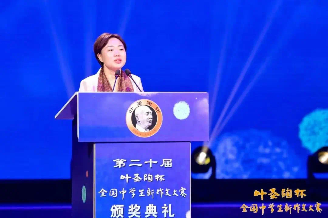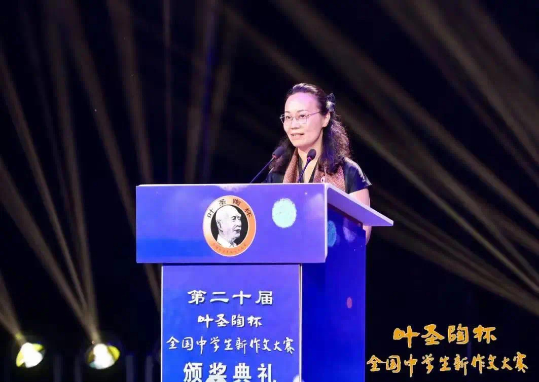 湖南省中南传媒集团新教材有限责任公司《新课程评论》杂志主编郑艳代表大赛支持单位,祝贺第二十届叶圣陶杯大赛颁奖典礼的成功举办。她在致辞中介绍了他们“真感情、真实践、真思索”的办刊选稿标准,而这个标准就来自叶圣陶先生的影响。她还例举了叶圣陶在1919年《新潮》杂志发表文章对“作文”的基本定位,由此评价叶圣陶杯大赛为中学生成为更温暖、更有创造力、更注重独立思考能力的个体搭建了建设性的平台。而支持叶圣陶杯大赛这项公益活动就是支持新课程改革,希望以大赛为突破口,推动教育健康良性的发展。