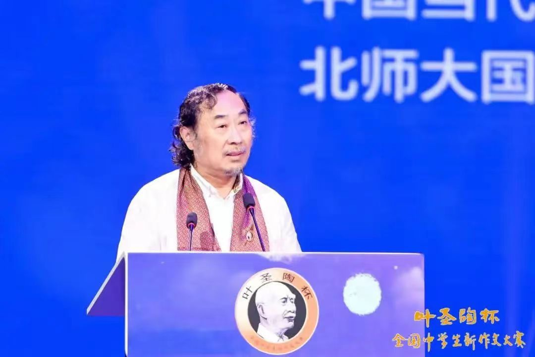 获奖选手代表、重庆巴蜀科学城中学高二学生刘峥岩同学在发言中分享了自己爱好文学的经历、感悟和参加叶圣陶杯大赛的收获。他说道,我们平常的作文课大部分是训练写议论文,这很容易使我们陷入套路化、模式化,甚至是写了一些大话、假话、空话,而叶圣陶杯大赛的决赛赛题,能启发我们从生活中找到真实可感的写作素材,唤醒我们对时代的思考,找到写作的灵感与突破口,所以在赛场上得心应手,写出了超越日常作文水平的获奖之作。