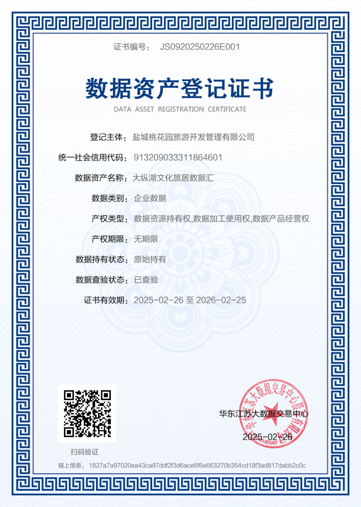 江苏大纵湖文旅发展集团有限公司子公司盐城桃花园旅游开发管理有限公司,依托桃花源景区丰富的文旅数据资源完成“大纵湖文化旅居数据汇”文旅数据资产入表,这是全市首笔国有企业文旅数据资产入表落地案例。